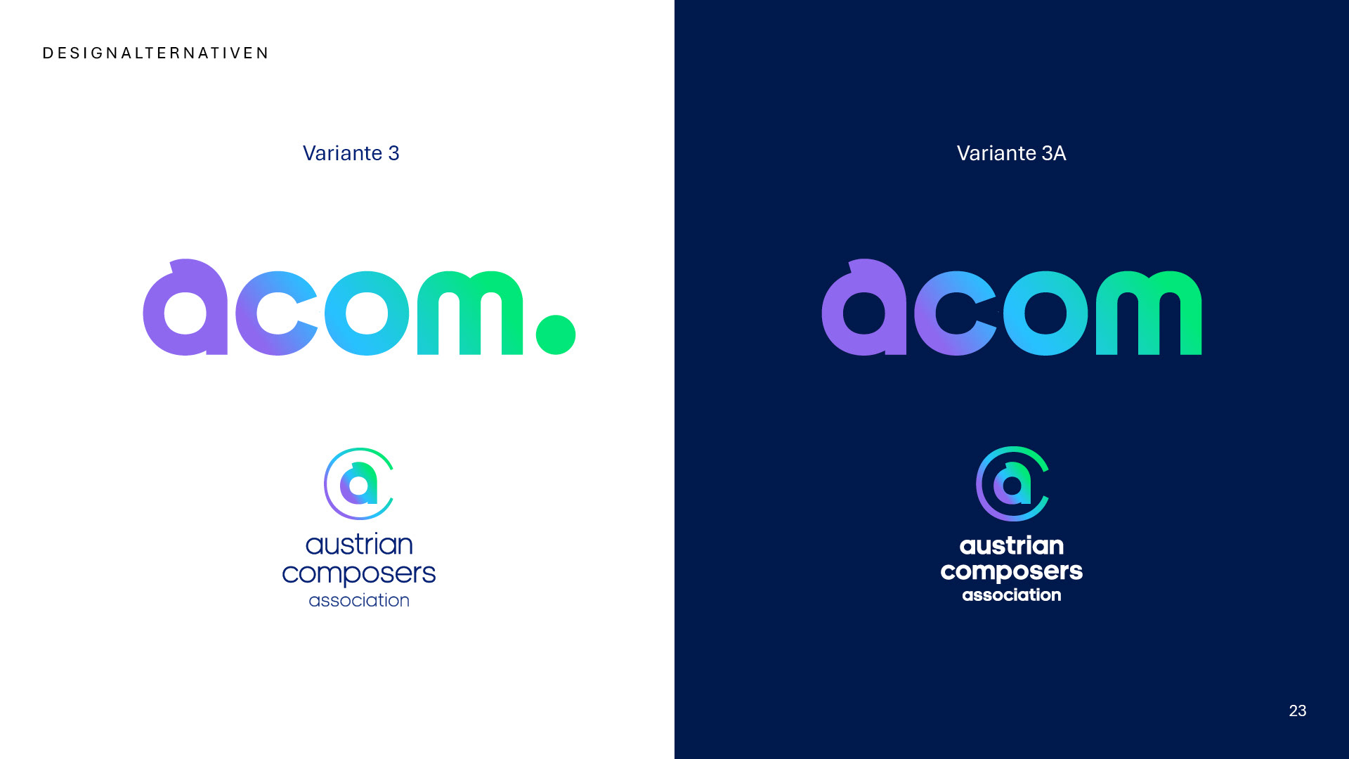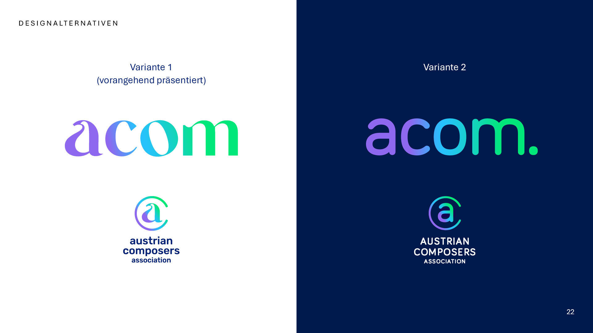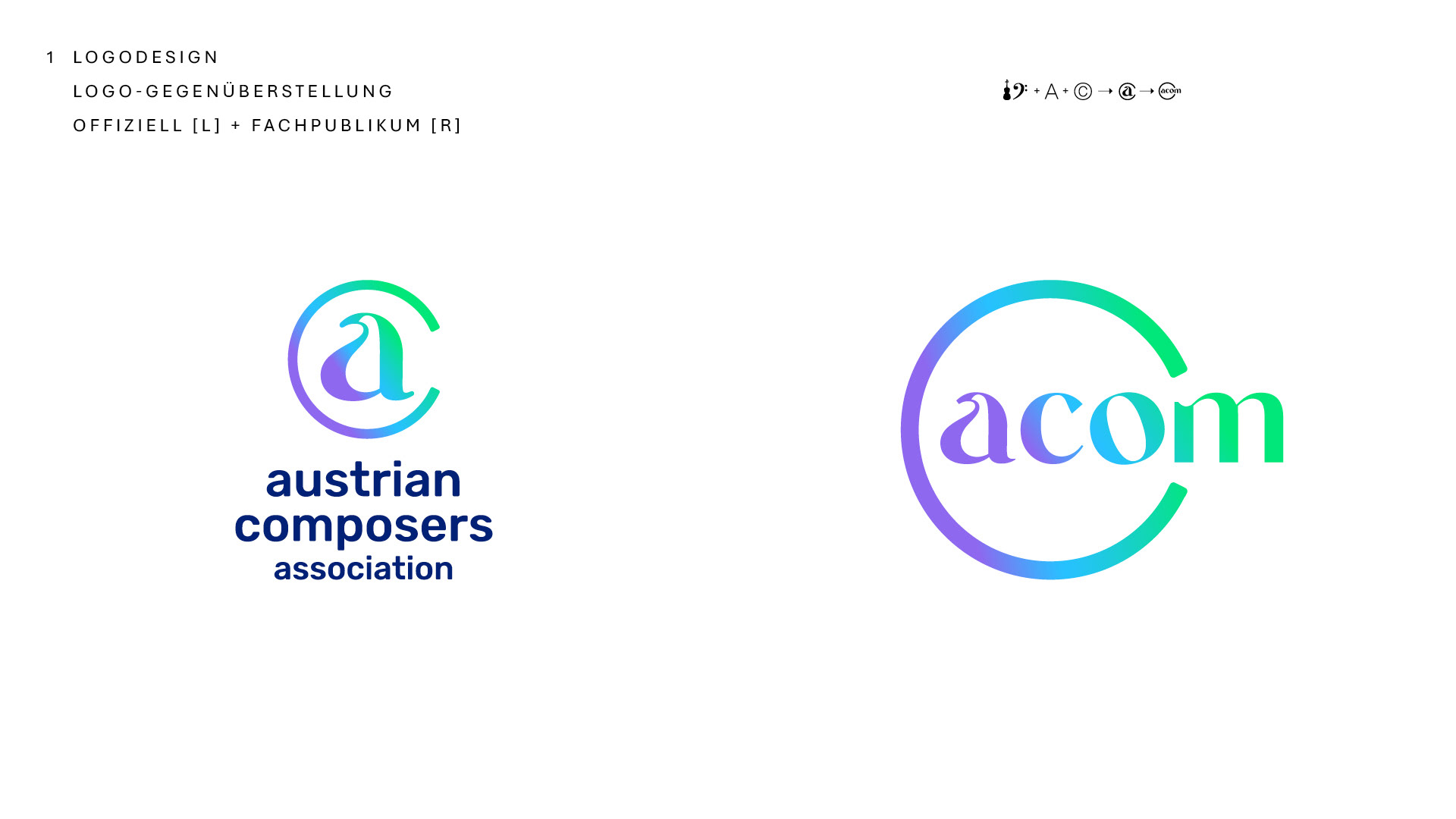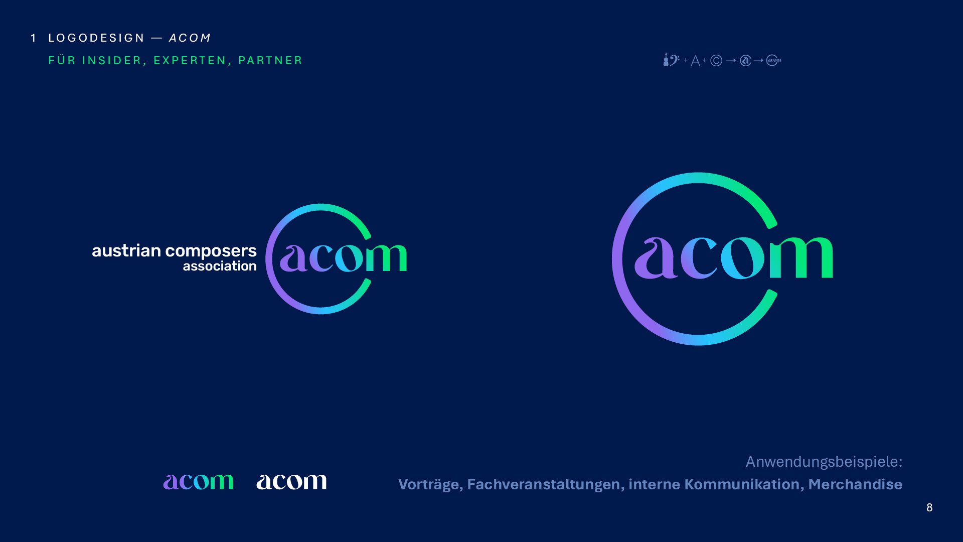 I was invited to present a redesign concept for their visual identity. The initial presentation — shown here in 24 slides — was already very close to the final version that was later implemented. During the presentation to the board, it became clear that the “acom” ‘a’ should play a more subtle role, while the wordmark ACOM should take center stage, as this abbreviation is the primary term used and recognized within the community. Additionally, the board requested a small adjustment to the upper curve of the letter ‘a’. You can scroll down to compare this initial proposal with the final version.