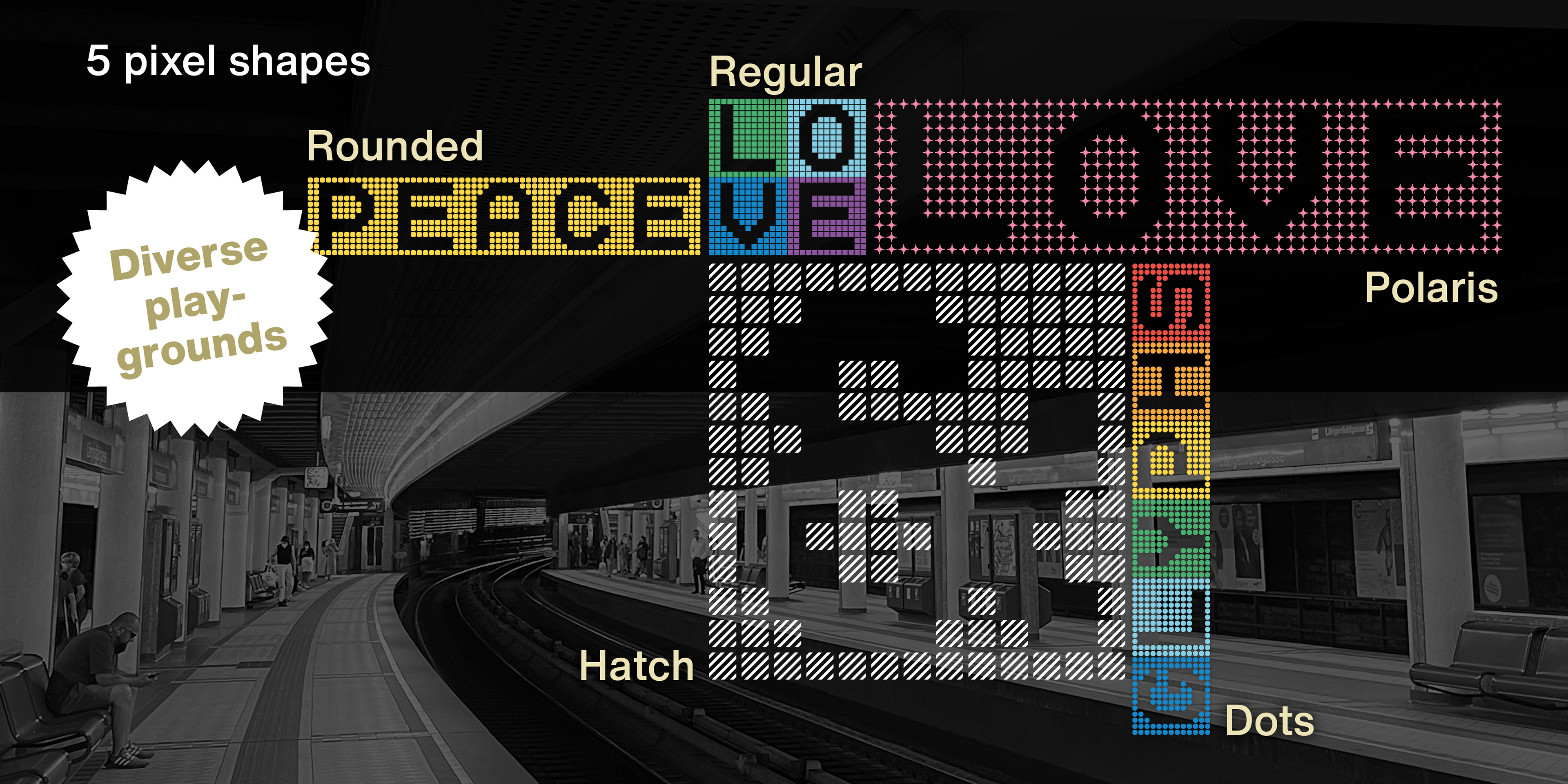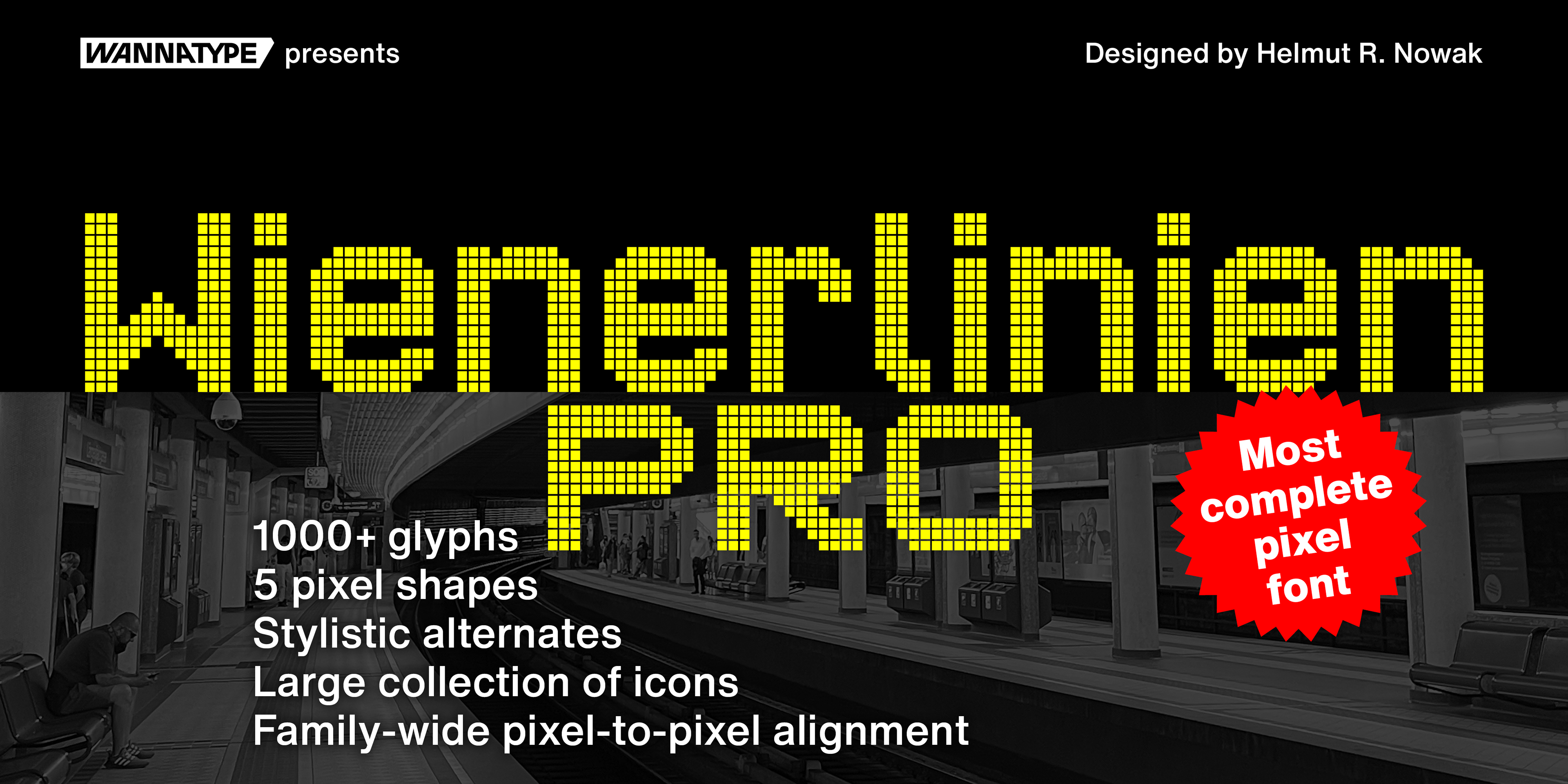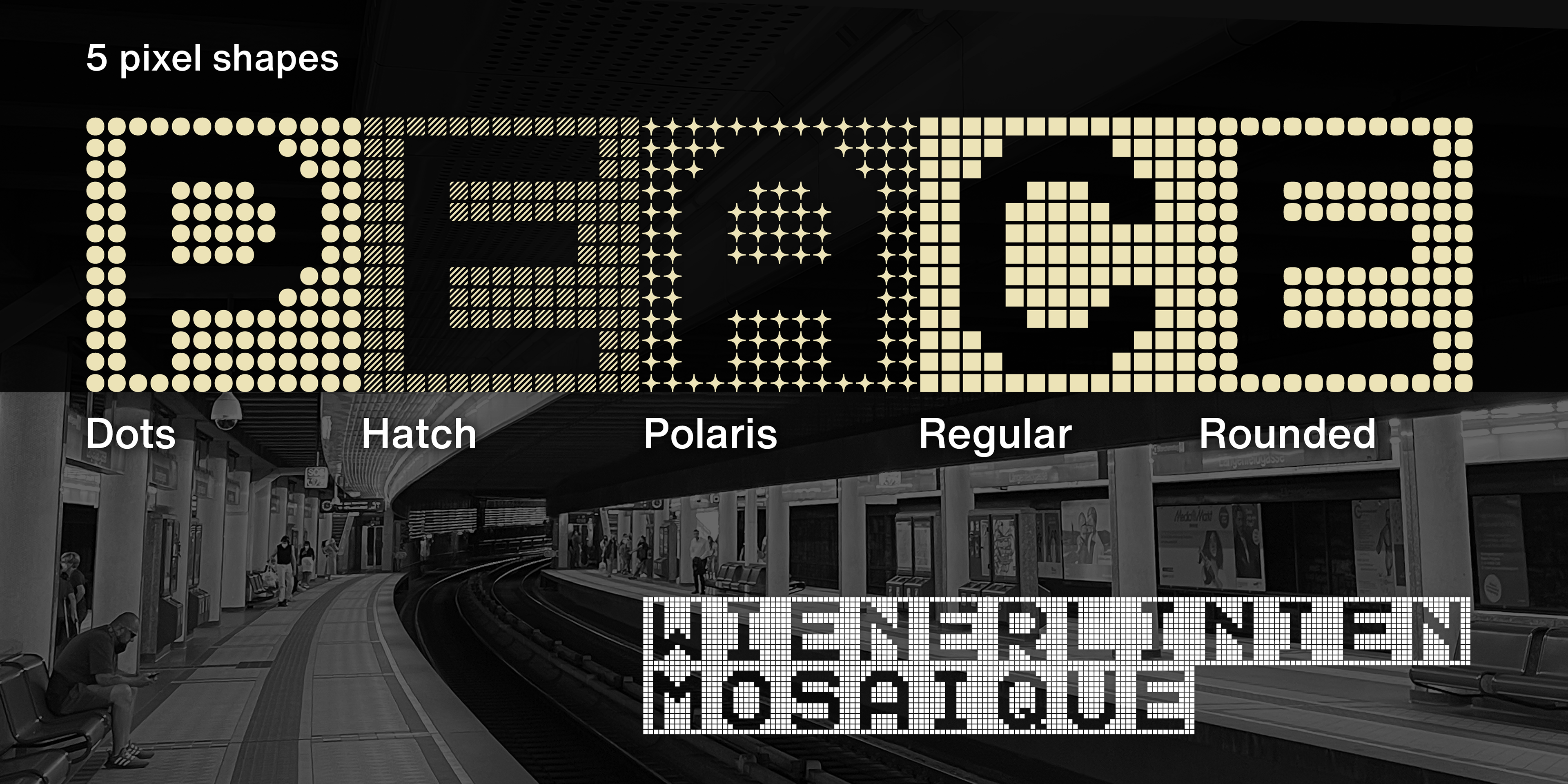 Wienerlinien Pro typeface was inspired by the bright yellow letters on the giant overhead signs of the Vienna subway. It’s a revised and refreshed version of the original characters and transformed into a timeless pixel font, easy to use in a digital environment. The font now consists of more than 900 characters and is one of the most comprehensive and sophisticated pixel fonts. The typeface has a special kerning: the individual pixels of each character are always exactly positioned on top of each other in each line. It includes multiple sets of numerals and many useful icons for public transport and beyond, as well as stylistic sets. Wienerlinien Poster is a compressed pixel font with 4 pixels stroke. It consists of uppercase letters and symbols. The font is especially suitable for poster design. Wienerlinien Mosaique consists of square tiles filled with pixels. You can create exciting mosaics and geometric shapes. Wienerlinien Captions is a font family constructed with as few pixels as possible. This set is perfect for marginal notes and crediting. Every design is available in five cuts: Dots, Hatch, Polaris, Rounded, Square.