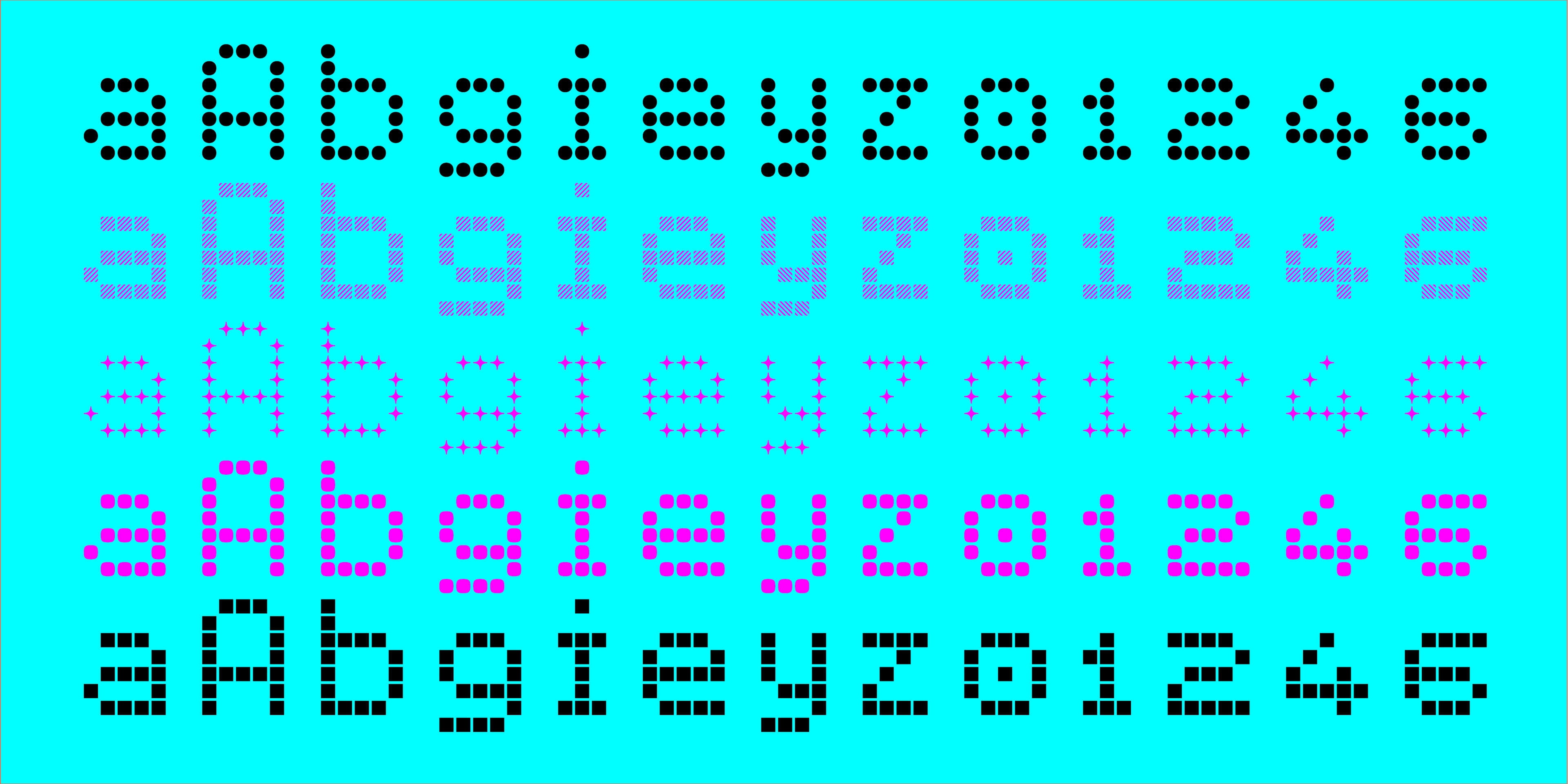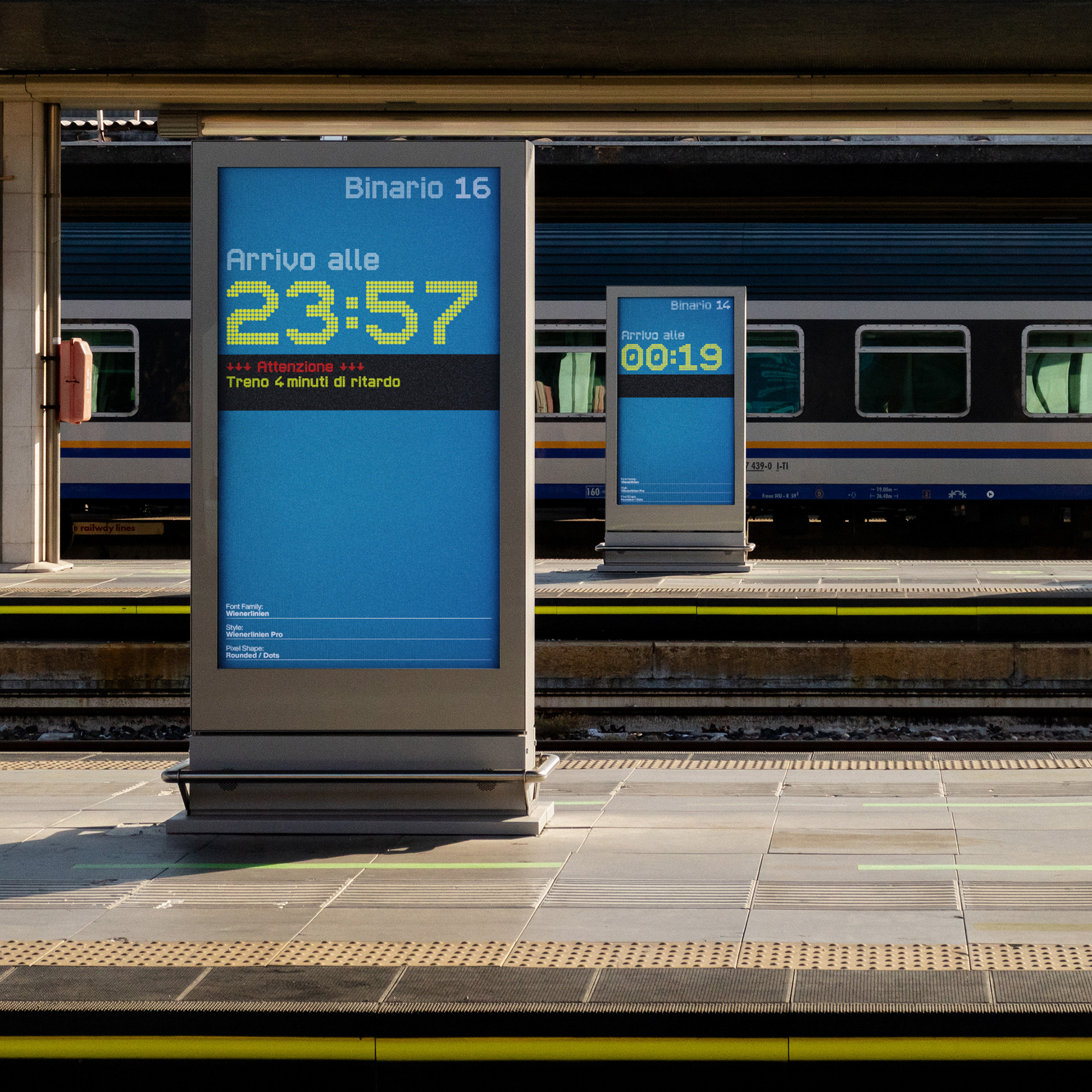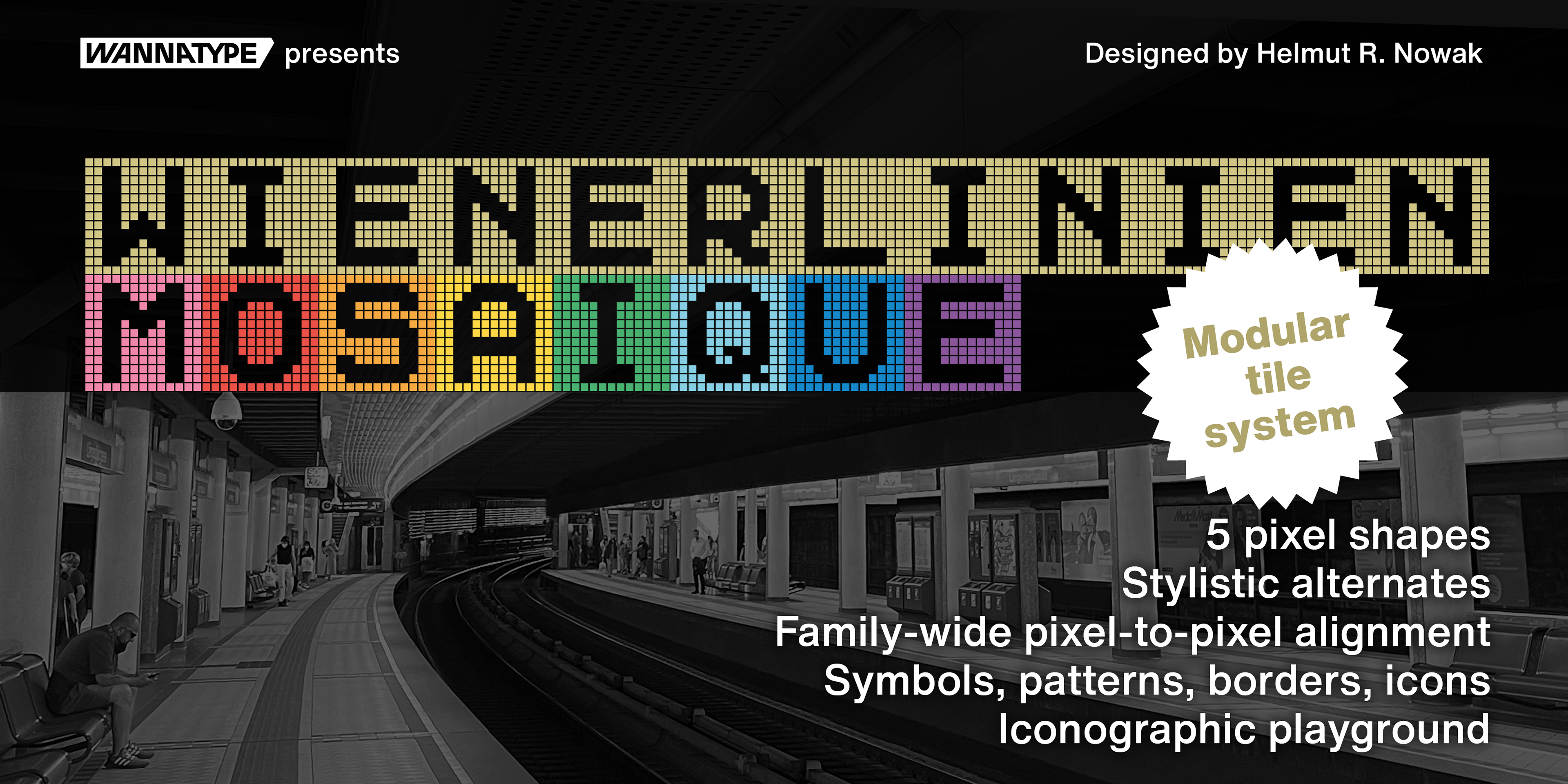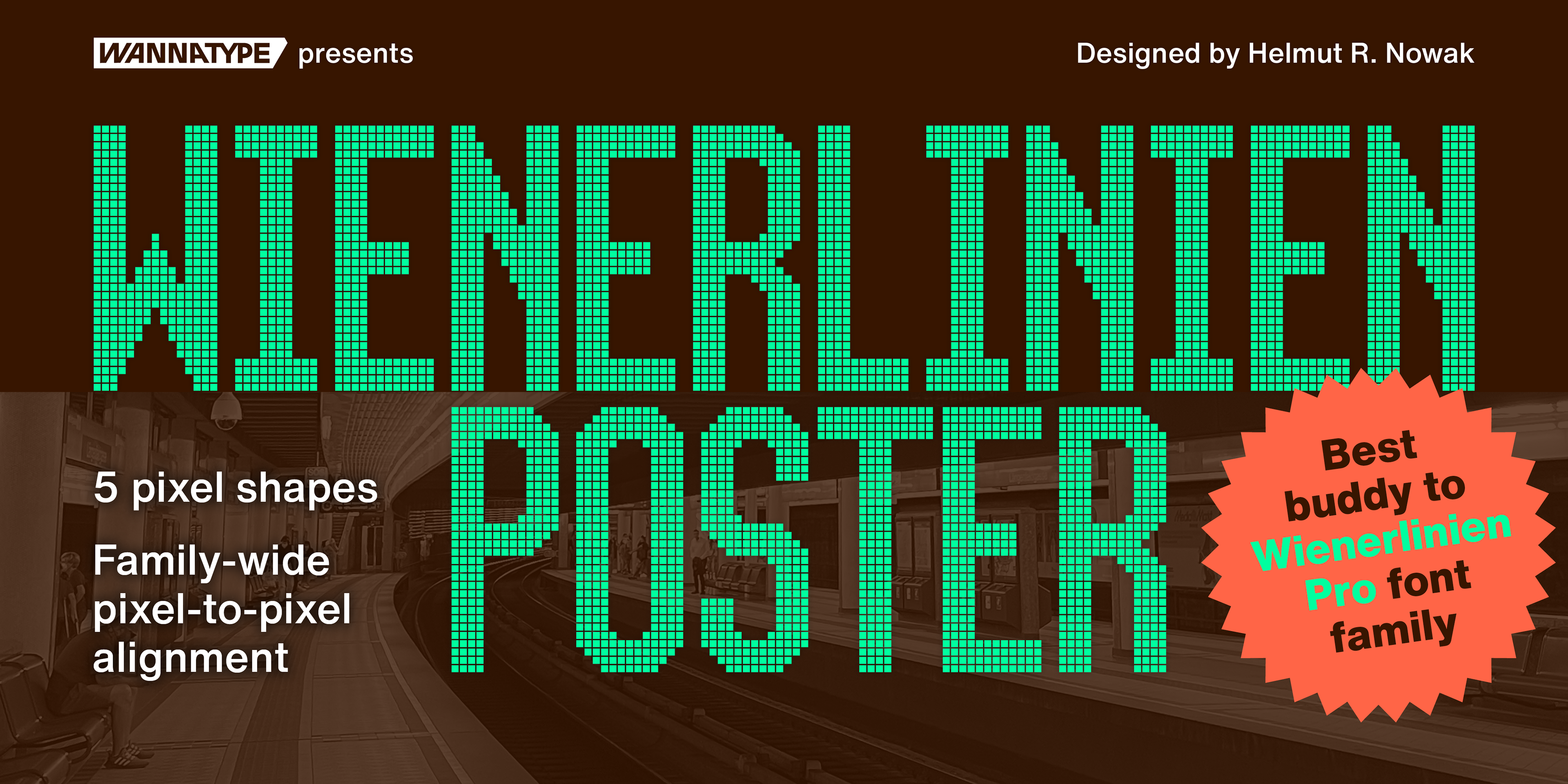 Wienerlinien Pro typeface was inspired by the bright yellow letters on the giant overhead signs of the Vienna subway. It’s a revised and refreshed version of the original characters and transformed into a timeless pixel font, easy to use in a digital environment. The font now consists of more than 900 characters and is one of the most comprehensive and sophisticated pixel fonts. The typeface has a special kerning: the individual pixels of each character are always exactly positioned on top of each other in each line. It includes multiple sets of numerals and many useful icons for public transport and beyond, as well as stylistic sets. Wienerlinien Poster is a compressed pixel font with 4 pixels stroke. It consists of uppercase letters and symbols. The font is especially suitable for poster design. Wienerlinien Mosaique consists of square tiles filled with pixels. You can create exciting mosaics and geometric shapes. Wienerlinien Captions is a font family constructed with as few pixels as possible. This set is perfect for marginal notes and crediting. Every design is available in five cuts: Dots, Hatch, Polaris, Rounded, Square.